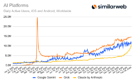 在这一维度上,市场情报机构Similarweb发现:3月2日,Claude在iOS与安卓端的日活跃用户达到1130万,较年初约400万的使用量增长183%,也高于2月初的500万日活。