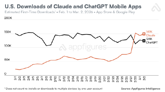 应用数据服务商Appfigures报告称,Claude移动应用在美国的下载量持续超越ChatGPT。该公司估算,3月2日的最新数据显示:Claude日下载量为14.9万次,而ChatGPT为12.4万次。